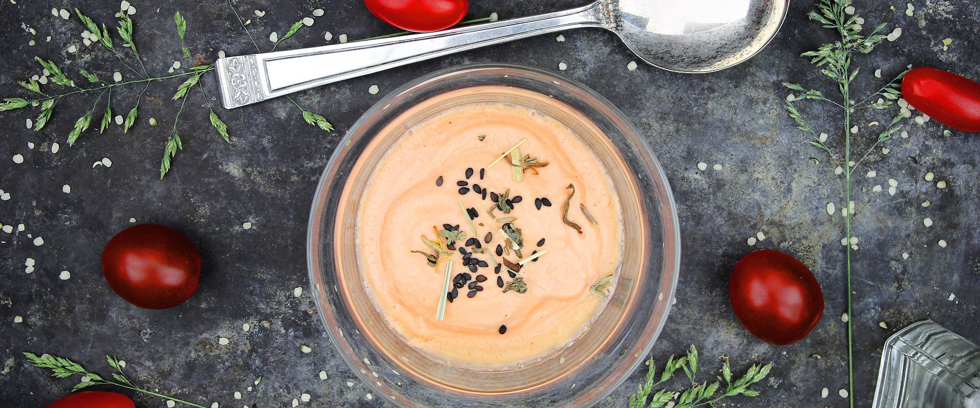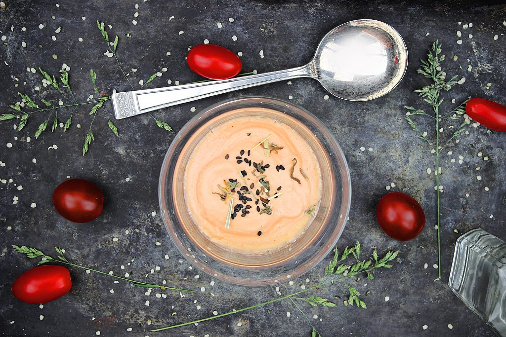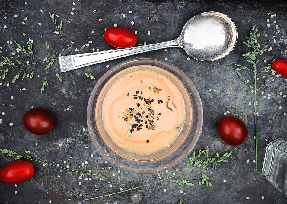 - 3. Garnish the raw tomato soup recipe with sunflower sprouts! Eat immediately.