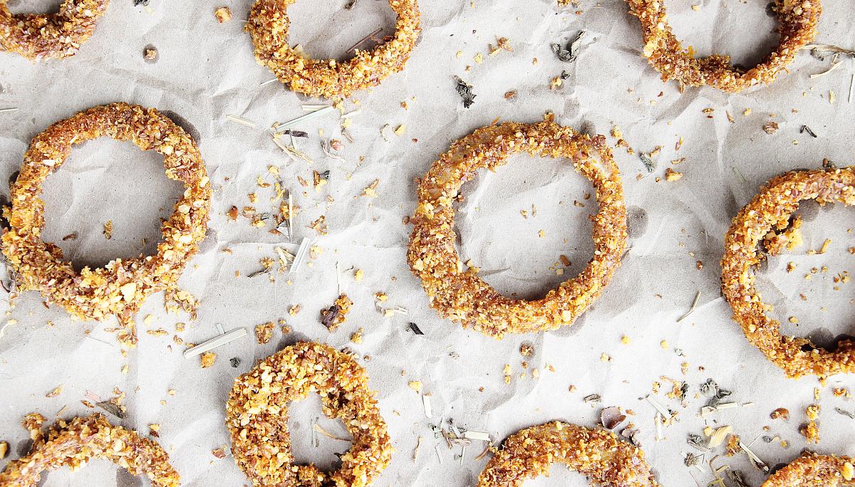 Now, moving on to the “other” category: I think some of these recipes are actually in my members-only area, called The Rawtarian’s Kitchen, but you can probably find lots of different recipes out there. In my “other” category, some of my really favorite delicious salty snacks would be onion rings. They are so good. I just actually made them and rephotographed them lately, and they’re so delicious. Basically you’re taking a sweet onion (you can get these at the grocery store; usually they’re called “sweet onions” - where I shop in Canada anyway. They’re a lot different than just the white onions. Sweet onions have a more subtle flavor and of course a sweeter flavor and a less, like, “Whoa! Onion!” flavor. If you’re going to make onion rings, you do want to try to get an onion that has a milder flavor, and a sweet onion works really well for this). Basically you’re just slicing up onions rings and breading it in this nice mixture - oh my gosh, what’s in it? I just made it lately. I think it’s nutritional yeast and flaxseed. Just ask me for it if it’s not available for free. I’ll give it to you! But basically those onion rings are super good.