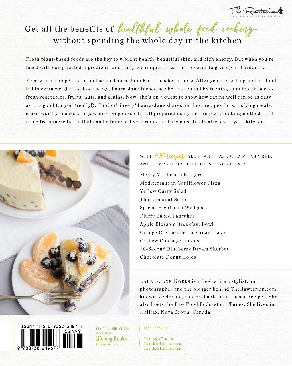 Laura-Jane is known for her easy and accessible plant–based cuisine on her blog TheRawtarian.com. In "Cook Lively!", she shares satisfying recipes to whip up healthy meals with as few ingredients and prep as possible. "Cook Lively!" is the go-to cookbook when you're hungry for something wholesome, delicious, and quick.