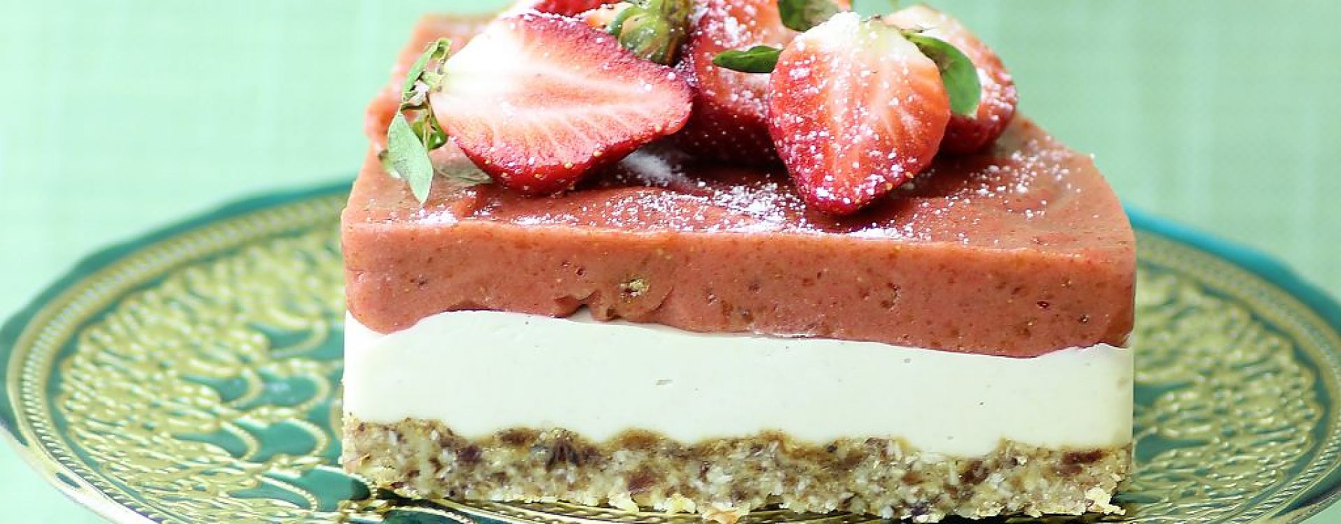 Instead of a cream cheese filling, this recipe uses cashews, coconut oil and agave (or honey), plus lemon juice and vanilla. See, no dairy! The crust is also divinely delicious as macadamia nuts are its primary ingredient. Yum!